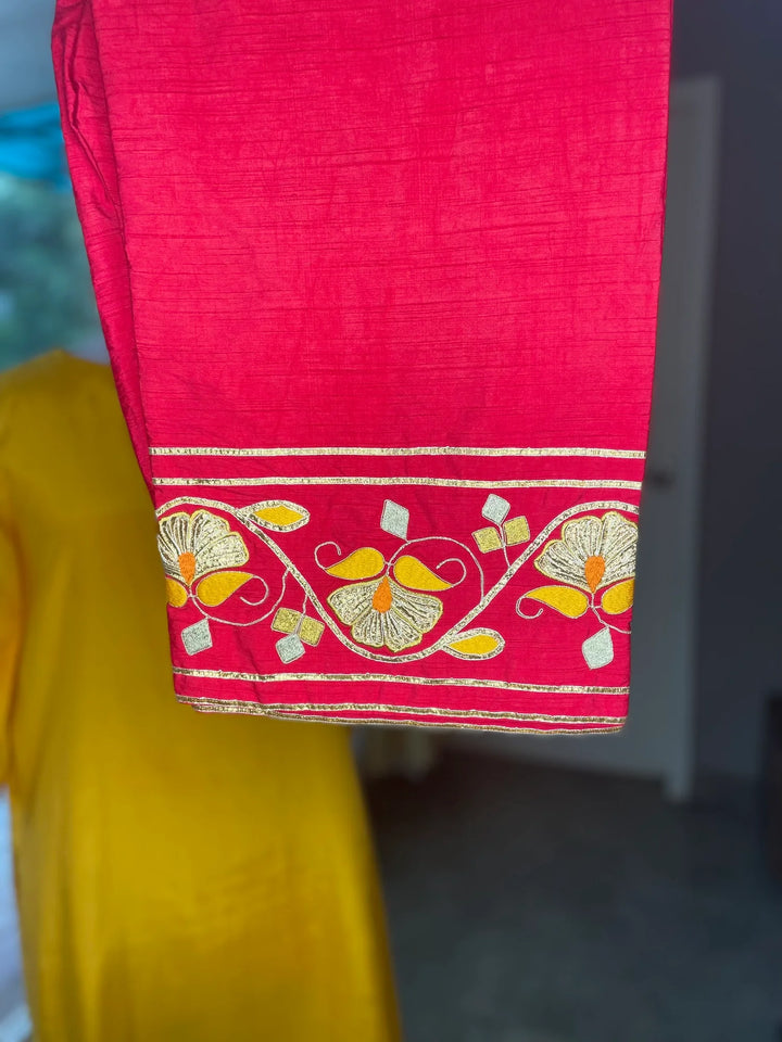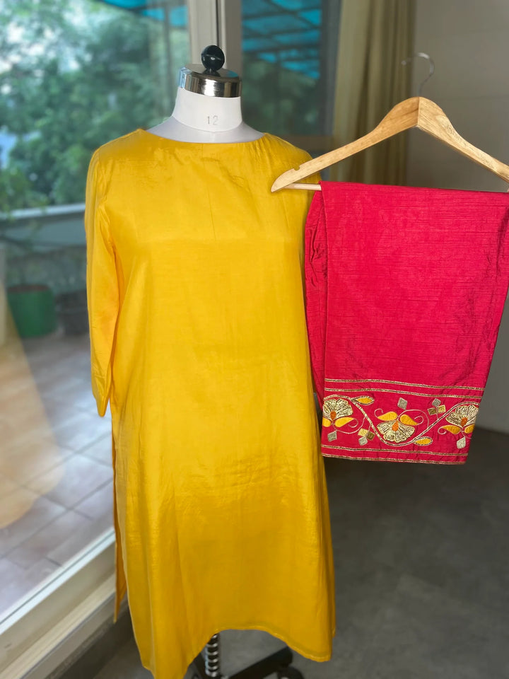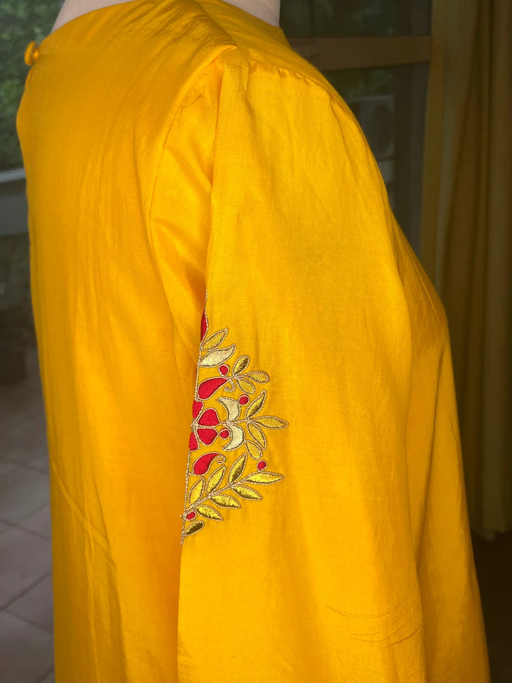 Yellow cotton silk kurta with beautiful embroidery on sleeves.
